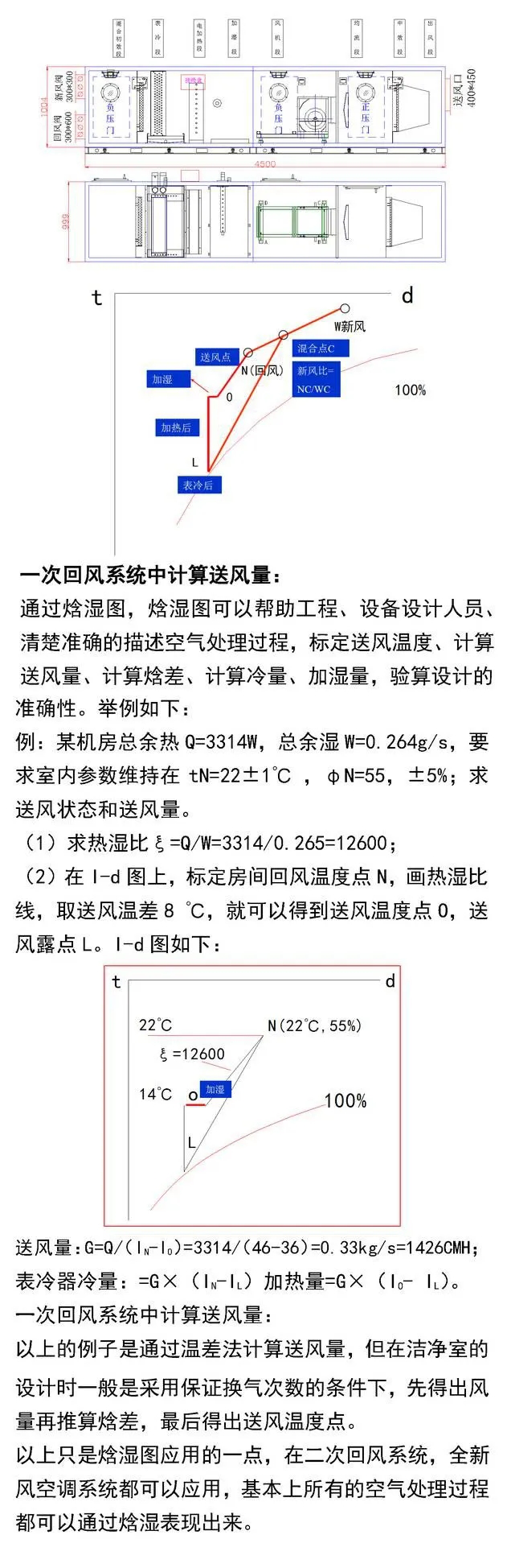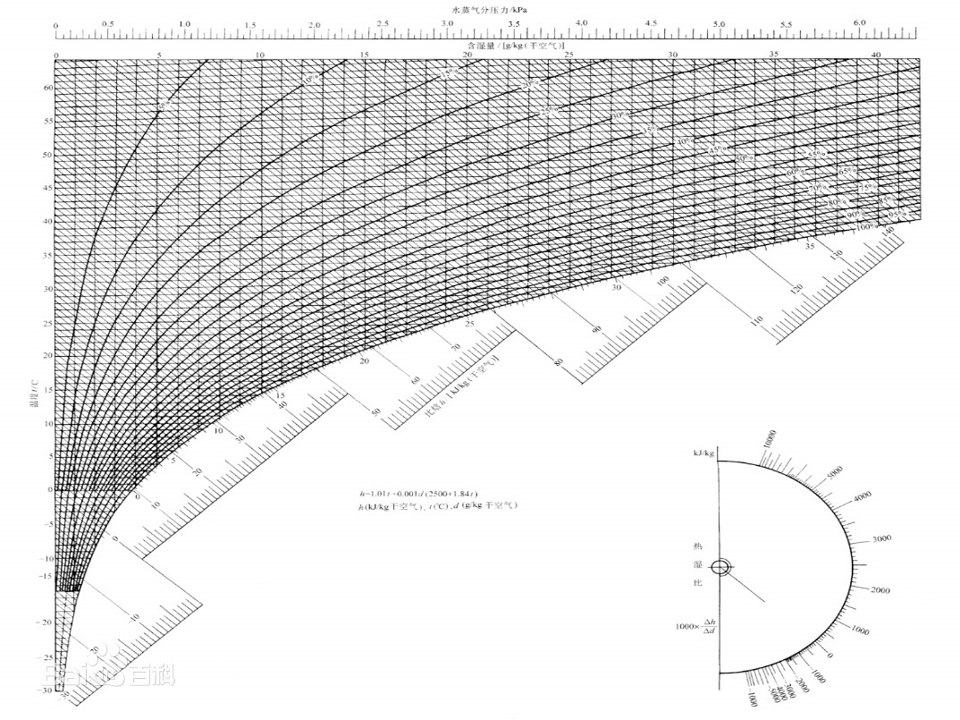 下圖為濕空氣焓濕圖(部分)的示意圖(圖片來(lái)源百度百科)。 該圖是以1kg干空氣的濕空氣為基準(zhǔn)繪制的。不同大氣壓的焓濕圖是不同的。焓濕圖上有幾種等值參數(shù)線:等焓(h)線—與縱坐標(biāo)成135°角的直線;等含濕量(d)線—平行縱坐標(biāo)軸的直線;等干球溫度(t)線—近似水平的直線;等相對(duì)濕度(Ø)線—圖中的曲線;等濕球溫度線近似與等焓線平行,圖中未表示;水蒸氣分壓力(pw)與d成單值函數(shù)關(guān)系,其值表示于d的上方,等pw線平行于等d線;圖的右下方給出了熱濕比ε的方向線,熱濕比又稱角系數(shù)。