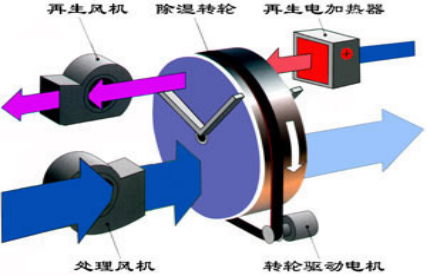當處理空氣通過轉輪的處理區域時,其中的水蒸汽被轉輪中的吸濕介質所吸附,水蒸氣同時發生相變,變為液態水,并釋放出潛熱;這時,處理空氣因自身的水份減少而變成干空氣;之后,處理空氣由處理風機送出,變成干的、熱的空氣。
