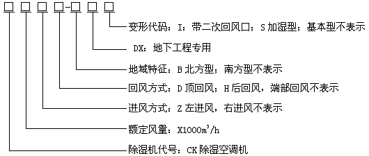 型號(hào)示例: CK12-DX 表示名義風(fēng)量為12000m3/h,回風(fēng)方式為端部回風(fēng)的南方型地下工程用除濕空調(diào)機(jī),面對(duì)機(jī)組控制器,回風(fēng)口在右側(cè)。