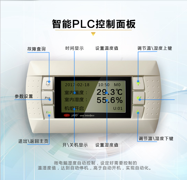 根據(jù)室內(nèi)溫濕度的設(shè)計要求,實時檢測室內(nèi)的溫濕度、室外溫度和系統(tǒng)的運行狀態(tài),根據(jù)室內(nèi)溫濕度的變化和室外溫度條件,自動轉(zhuǎn)換系統(tǒng)的運行模式,以保證室內(nèi)的溫濕度要求和系統(tǒng)安全運行。